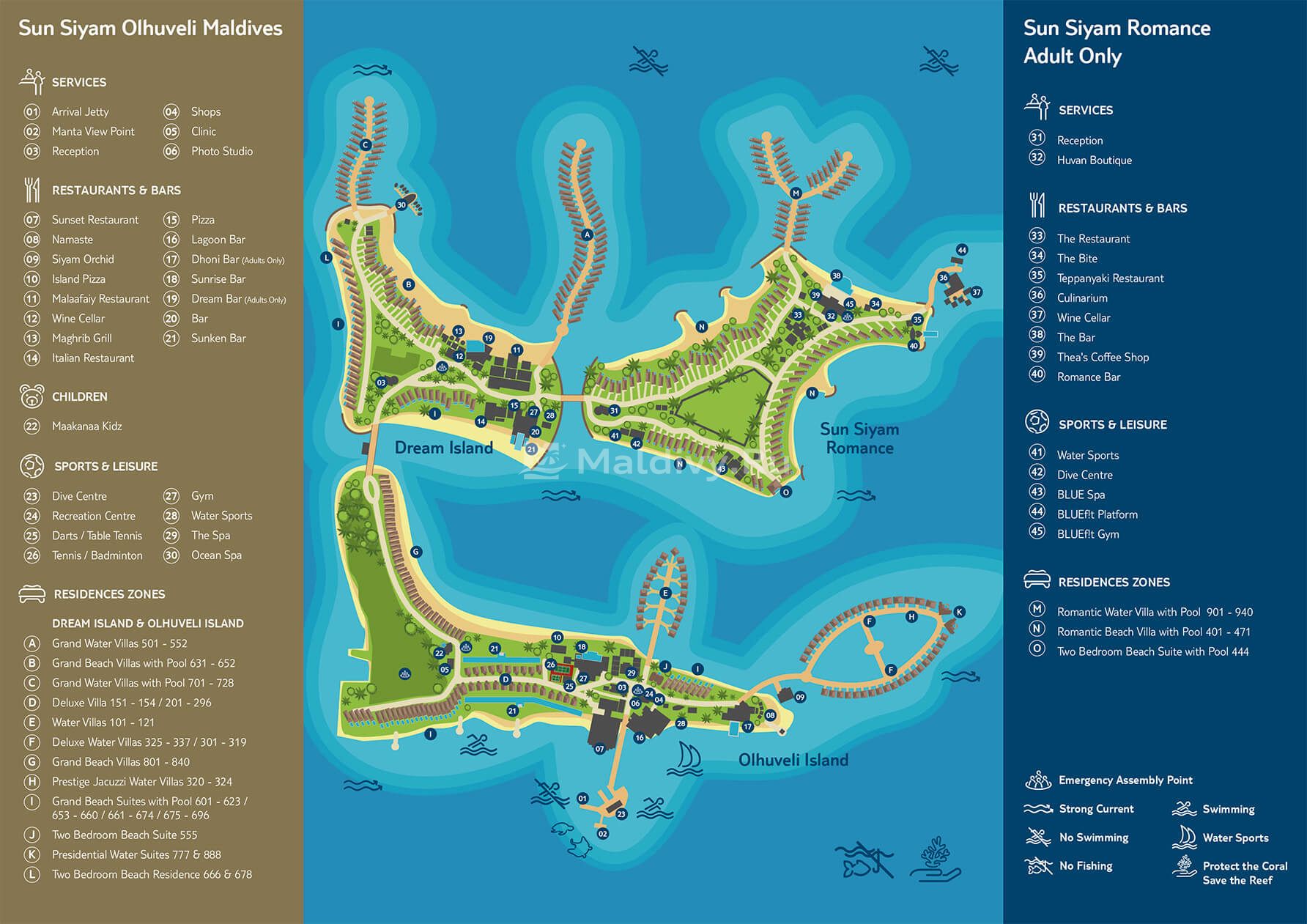 Sun Siyam Olhuveli Maldives представляет собой кластер из трех островов: Main (или Olhuveli), Dream (семейный), Romance (только для взрослых, иногда позиционируется как отдельный отель). Они соединены мостами. Гости любого из островов могут пользоваться опциями других, за единственным исключением: дети не могут посещать Romance. Получается, что в их распоряжении не только одна из почти пяти сотен вилл, но и пара десятков ресторанов и баров, 11 бассейнов на любой вкус (в том числе, и самый длинный на Мальдивах), 3 спа, 2 фитнес-центра, грандиозный детский клуб, бескрайние возможности для дайвинга и водного спорта и множество других опций.