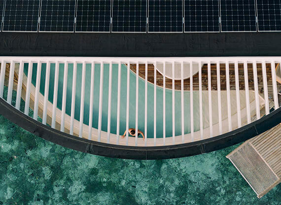 Очаровательная Ocean Pool Villa представляет собой идеальный круг. В эту фигуру вписано как внутреннее, так и внешнее пространство виллы: просторная спальня, большая ванная, туалет, душевые, солнечная терраса, интегрированная с инфинити-бассейном. Изящный штрих – небольшая надводная платформа с сетью.