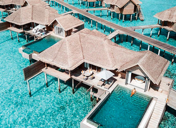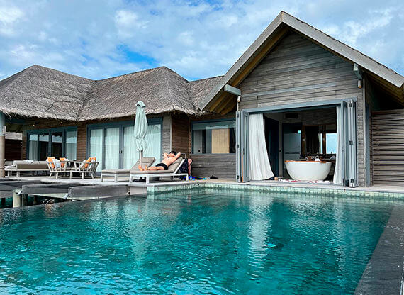 При резиденциях имеются инфинити-бассейны площадью 24–55 м2 (в зависимости от категории). Самый большой пейзажный бассейн – при роскошной The Vakkaru Over Water Residence.