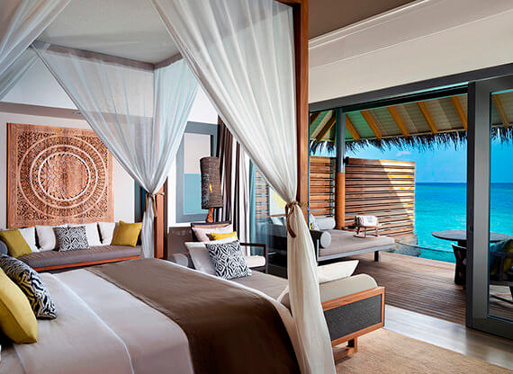 Планировка Over Water Villa включает спальню с огромной королевской (king-size) кроватью и кушеткой, ванную комнату с видом на океан, санузел, два душа и просторную террасу с надводной сетью. Уединение и бескрайний океан – что еще нужно влюбленным?