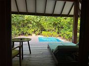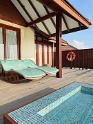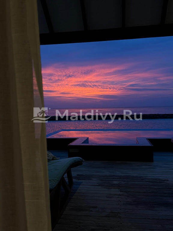 40 минут трансфера на спидботе (ни минуты не ждали, сразу отчалили), напитки, шоколад, шампанское и барабаны на причале – сразу в сказку попадаешь. Вилла хоть и не очень большая и прям роскошная, но все необходимое в ней есть. Даже любимая мной косметика Elemis. Чистота просто стерильная. Бассейн, вид на закат!