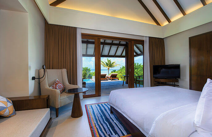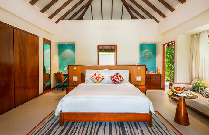 Роскошные надводные бунгало Varu by Atmosphere распределены по трем ветвям. Каждая локация имеет собственное имя. В Dolphin и Turtle, примыкающих к острову со стороны заката, расположены виллы с бассейнами: Water Villa with Pool и единственный роскошный Water Suite. В южной локации Manta находятся номера категории Water Villa. Все надводные бунгало дополнены видовыми ванными комнатами с полноразмерными ваннами и террасами с прямым доступом к лагуне.