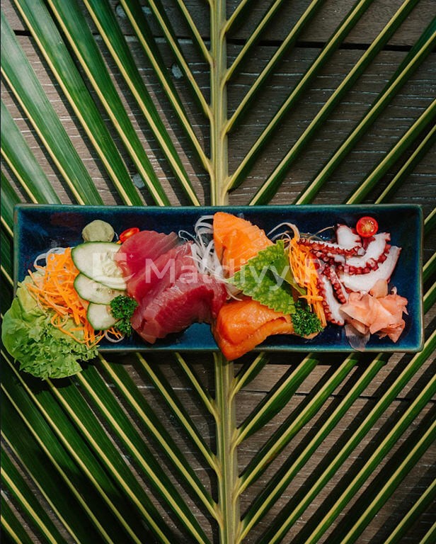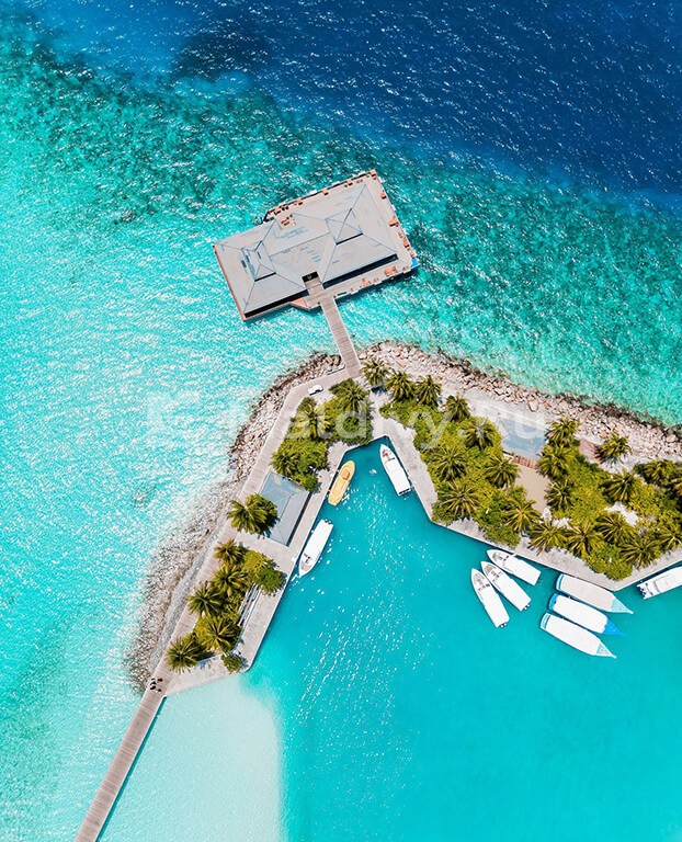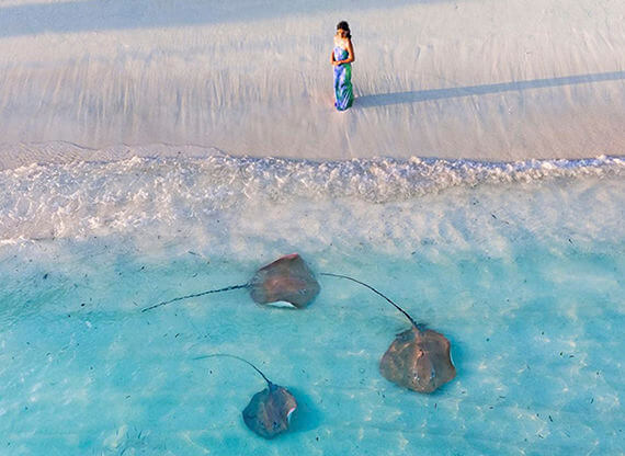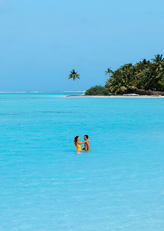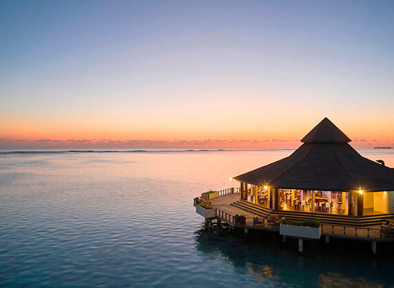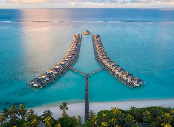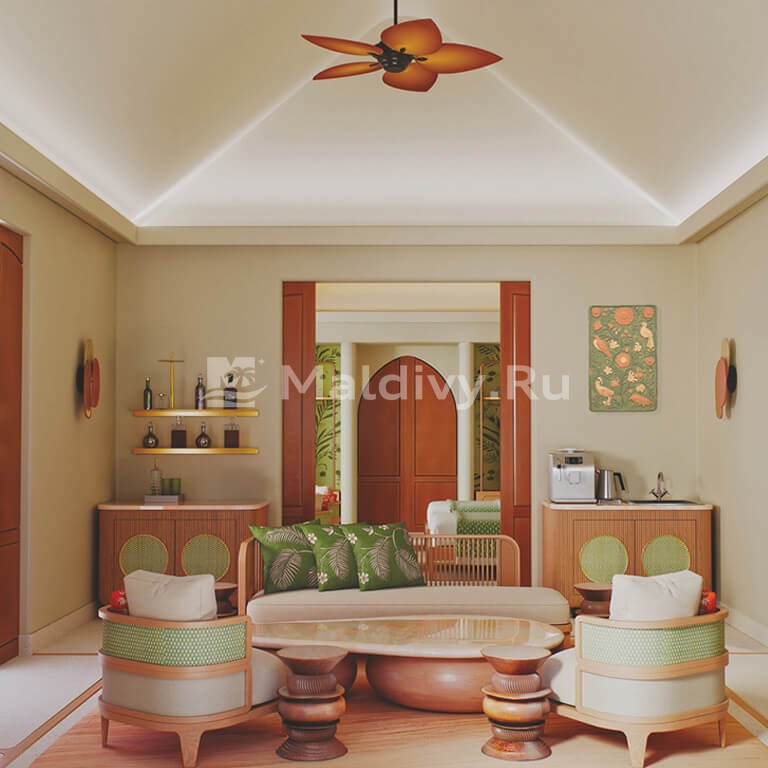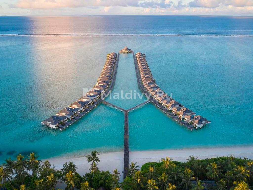 Во главе надводного номерного фонда отеля заслуженно стоят двухкомнатные люксы Two Bedroom Overwater Suite. Отдельная гостиная, три ванных комнаты, терраса с джакузи, комфортны спуск в лагуну… Все это – над безупречным хрусталем лагуны в конце ветви водных вилл!