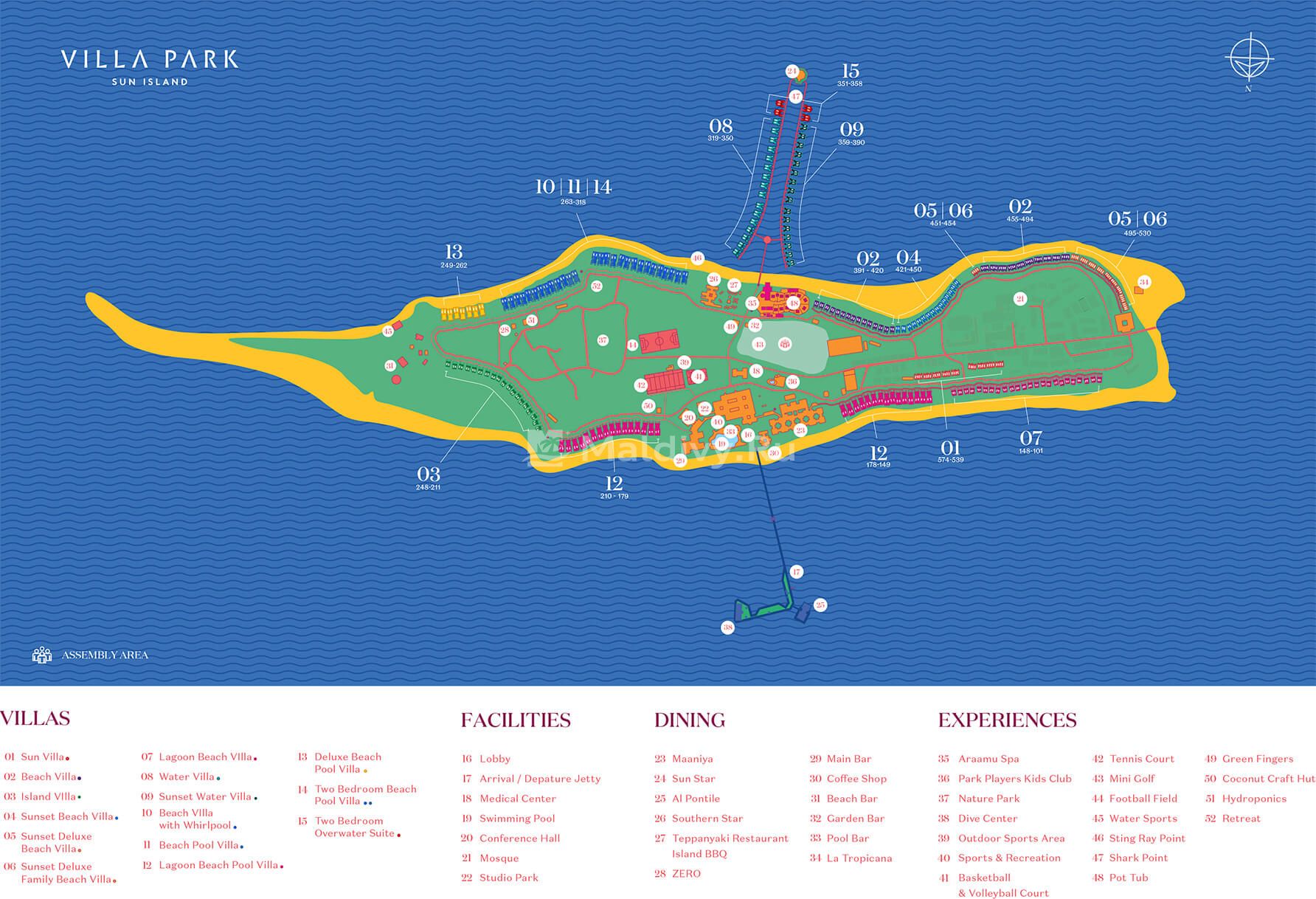 Остров Налагурайду, занятый Villa Park (бывшим Sun Island Resort & Spa), огромен: 1600 х 440 м. Неудивительно, что на столь внушительной площади сумели разместиться 462 виллы (преимущественно спаренные), самый большой на Мальдивах спа Araamu, обширная органическая ферма Green Fingers с банановыми плантациями и гидропонными сооружениями, грандиозный клуб для детворы Park Players, поле для гольфа, десяток ресторанов и баров и масса других объектов инфраструктуры. Все береговые виллы (а их большинство) имеют прямой выход к пляжу, опоясывающему весь остров. Локация надводных бунгало находится у северного побережья.