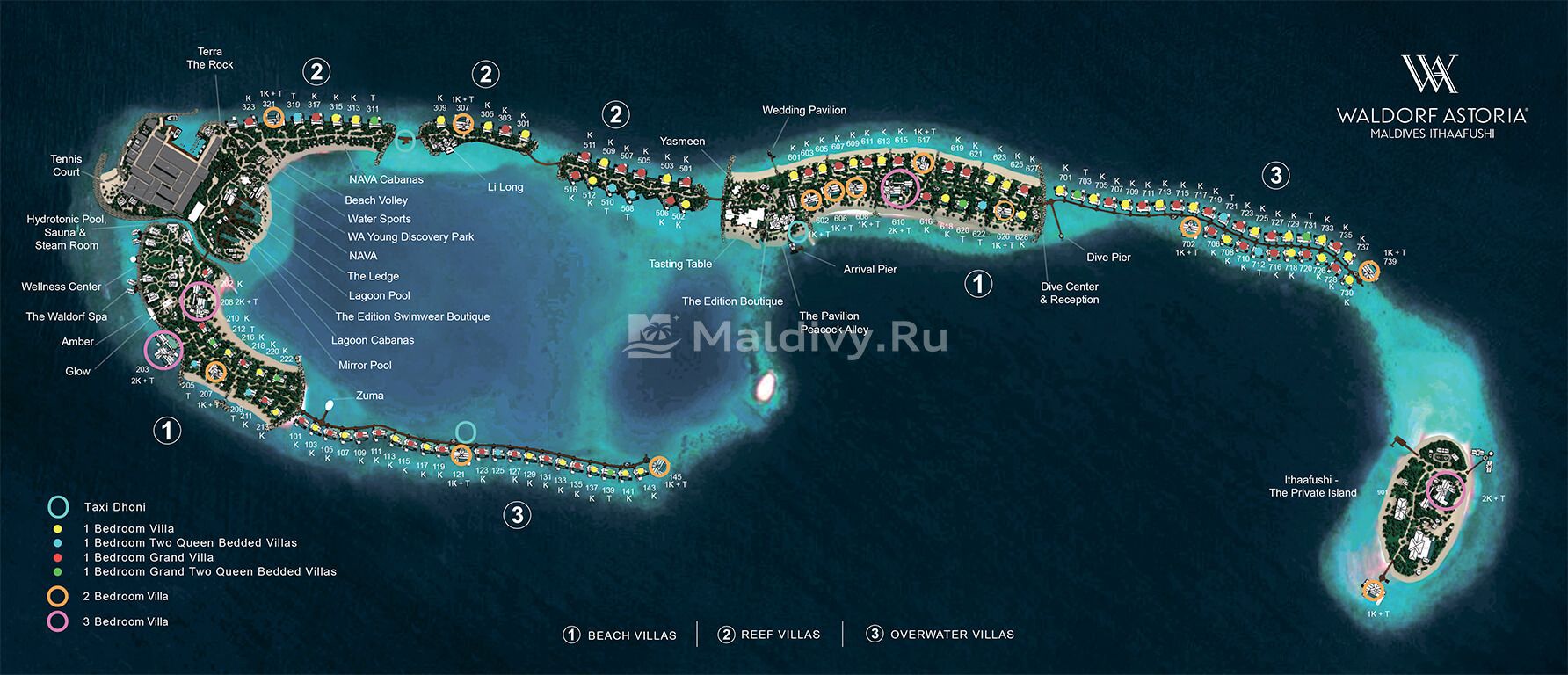 Роскошный Waldorf Astoria Maldives Ithaafushi оккупировал целый архипелаг, в котором острова соединены мостами. Особняком стоит Ithaafushi The Private Island (продается целиком) с собственной инфраструктурой, вход на который другим гостям запрещен. Но и на других островах нет недостатка в классных ресторанах и барах (их более десятка), спортивных площадках, бассейнах, лаунжах, бутиках и прочих атрибутах фешенебельного релакса. Особого внимания заслуживают великолепные клубы для детей и подростков, центры дайвинга и водного спорта, Aqua Wellness и Waldorf Astoria Spa площадью в 10 000 м2. Все виллы отеля дополнены бассейнами. Причем, помимо привычных береговых и надводных, резорт располагает уникальными номерами Reef Villa, расположенными вдоль миниатюрных островков у домашнего рифа.