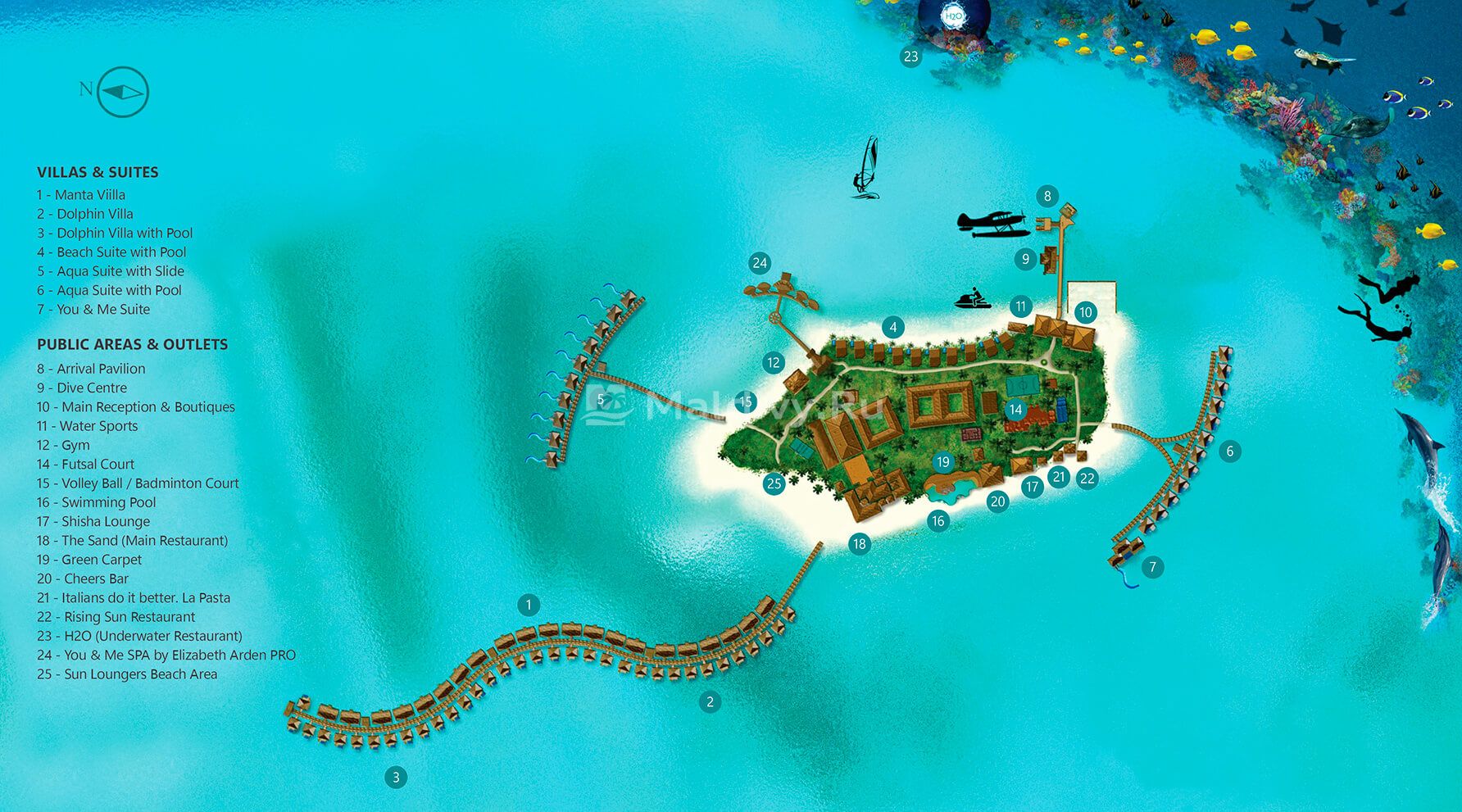 You & Me Maldives расположился на небольшом островке 345 x 180 м. Отель ориентирован преимущественно на романтический отдых (концепция «только для взрослых»), поэтому в приоритете приватность. Виллы отеля расположены на солидном расстоянии друг от друга (за исключением спаренных Lagoon Villa). Львиная доля номерного фонда разбросана по трем надводным локациям, есть виллы с бассейнами и водными горками. На острове расположены спортивные площадки, большинство ресторанов и баров, центры Water Sports Mission и Dive Mission (SSI). С восточной стороны к острову примыкает надводный You & Me Spa by Elizabeth Arden, а еще дальше, на домашнем рифе, расположен легендарный подводный ресторан H2O.